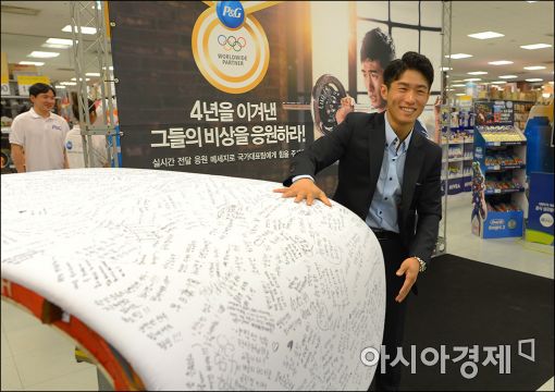 [아시아경제 윤동주 기자] 양학선 기계체조 국가대표 선수가 29일 서울 이마트 영등포점에서 열린 '응답하라 양학선' 팬사인회에서 팬들의 응원 메시지가 적힌 도마 옆에서 포즈를 취하고 있다.