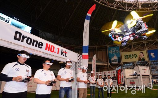 [아시아경제 윤동주 기자] 29일 서울 구로구 고척 스카이돔에서 열린 'KT, GiGA 드론레이싱 왕중왕전'에 참가한 선수들이 경기 시작 전 각자의 드론으로 연습을 하고 있다.