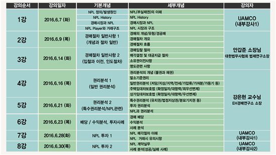 강사진도 화려하다. 우선 유암코 자산관리본부 사내강사진이 NPL에 대해 강의하고, 서울중앙지방법원 집행관을 역임하고 현 대한법무사협회 법제연구소 소장으로 재직중인 안갑준 소장 한국부동산자산관리사 전문위원이자 '경매야 놀자' 저자인 강은현 소장이 NPL 성공 투자 노하우를 전수할 예정이다.