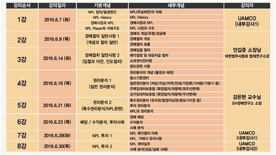 유암코 자산관리본부 사내강사진이 NPL에 대해 강의하고, 서울중앙지방법원 집행관을 역임하고 현 대한법무사협회 법제연구소 소장으로 재직중인 안갑준 소장, 한국부동산자산관리사 전문위원이자 '경매야 놀자' 저자인 강은현 소장 등이 강사로 나선다.