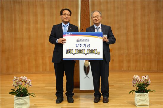 [아시아경제(대전) 정일웅 기자] 한남대는 8일 교내 정성균 선교관에서 이덕훈 총장으로부터 5000만원의 대학발전기금을 전달받았다고 밝혔다. 이 총장은 한남대 경영학과를 졸업한 동문 출신으로 올해 3월 ‘제16대 한남대 총장’으로 취임했다. 또 취임 후에는 대학 내 재정난을 타개하기 위해 총장 전용차를 없애는 등으로 경비를 절감하는 한편 대학발전기금 확충에도 힘을 쏟고 있다. 대학발전기금 전달식을 마치고 이 총장(왼쪽)과 신동민 학사부총장(오른쪽)이 기념사진을 찍고 있다. 한남대 제공