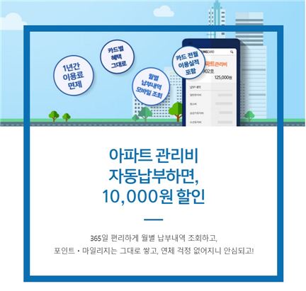 신한카드와 삼성카드는 자동이체를 신청한 첫 달 1만원을 할인해준다. 또 서비스 수수료 월 700원을 각각 세대당 또는 1년동안 면제해준다. 삼성카드는 홈페이지와 모바일로 관리비 상세내역을 조회할 수 있는 서비스를 제공한다. 이벤트 기간은 신한카드는 다음달 31일, 삼성카드는 12월 31일까지다.