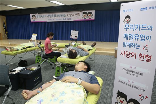 우리카드는 '세계 헌혈자의 날'을 같은 건물에 입주해있는 매일유업과 함께 이 행사를 공동기획 했다. 이날 행사에는 유구현 우리카드 사장을 비롯해 두 회사 임직원 150여명이 참여했다.