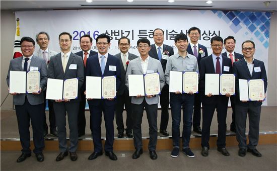 [아시아경제(대전) 정일웅 기자] 특허청은 30일 서울 강남구 역삼동 소재 한국지식재산센터에서 ‘2016년 상반기 특허기술상 시상식’을 개최했다. 특허청 이영대 차장(뒷줄 왼쪽 세 번째)과 한국발명진흥회 이준석 상근부회장(뒷줄 왼쪽 두 번째), 이태근 한국특허정보원장(뒷줄 왼쪽 여섯 번째), 대한변리사회 전광출 부회장(뒷줄 왼쪽 첫 번째), 특허청 장완호 특허심사기획국장(뒷줄 왼쪽 다섯 번째) 등 주요 인사들이 수상자들과 기념촬영을 하고 있다. 특허청 제공