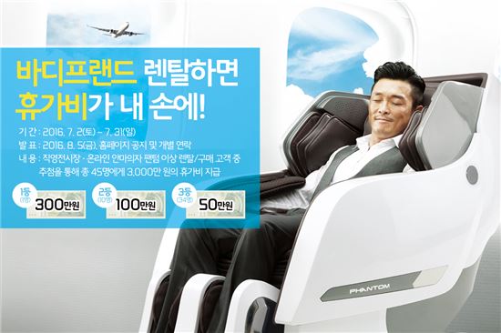 이번 이벤트는 7월 한달간 전국 108개의 직영전시장 또는 온라인을 통해 안마의자 렌탈 및 구매(팬텀 이상 모델) 고객을 대상으로 실시된다. 렌탈 및 구매자는 자동으로 이벤트에 응모되며 추첨을 통해 총 45명을 선정, 휴가비를 지원할 예정이다.