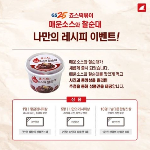 [아시아경제 오주연 기자]죠스떡볶이가 편의점에서 판매되는 ‘매운소스와 찰순대’를 이용한 나만의 레시피 만들기 이벤트를 진행한다고 5일 밝혔다.