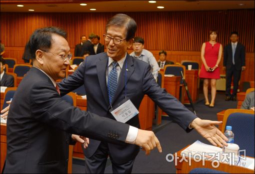 [아시아경제 윤동주 기자] 유일호 경제부총리 겸 기획재정부 장관이 12일 서울 여의도 국회에서 열린 '글로벌 금융학회'에 참석, 이동걸 산업은행장과 인사를 나누고 있다.