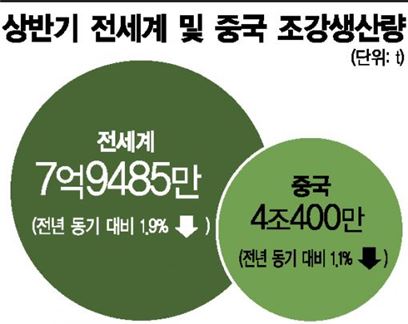 4일 철강업계에 따르면 중국은 올 상반기 1300만t의 철강설비를 폐쇄했다. 올해 목표치가 4500만t인 것을 감안하면 30%에도 못 미친 수준이다. 철강업계 관계자는 "철강재 가격이 오르면서 철강사 수익이 개선되면서 설비 폐쇄를 지연시킨 것"이라며 "조강 생산량 비중은 되레 늘었다"고 말했다. 상반기 글로벌 시장(7억9485만t)에서 중국의 조강생산(4억400만t)이 차지하는 비중은 50.3%였다. 1년 전(49.9%)보다 0.4%포인트 상승했다. 중국의 조강생산 감소폭(1%)보다 전세계 조강생산량 감소폭(1.9%)이 컸기 때문에 이런 현상이 벌어진 것이다.