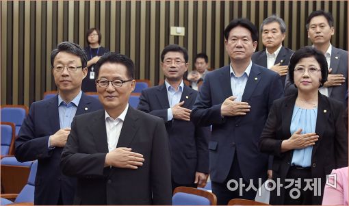 [아시아경제 윤동주 기자] 박지원 국민의당 비상대책위원장 등 의원들이 16일 서울 여의도 국회에서 열린 의원총회에 참석, 국민의례를 하고 있다.
