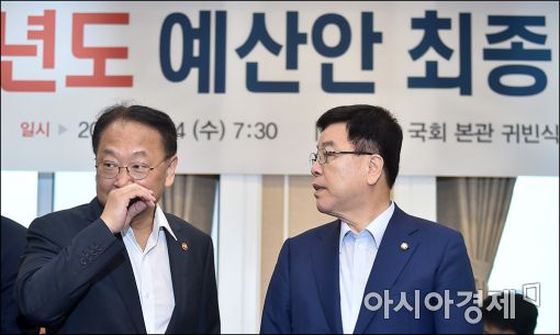 [아시아경제 윤동주 기자] 유일호 경제부총리 겸 기획재정부 장관(가운데)이 24일 국회에서 열린 '2017년도 예산안 최종 당정협의'에 참석, 김광림 새누리당 정책.