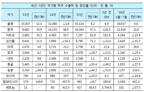 베트남 현지로 수출된 국산 맥주의 연도별 수출액은 2013년 1만1000달러에서 2014년 6만달러, 2015년 42만7000달러로 증가했고 이에 따른 수출액 성장률은 2014년 432.5%에서 2015년 614.5% 등으로 수직상승했다.