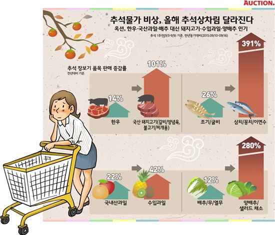 국내산 과일은 22% 증가하는데 그쳤다. 제수용 대표과일인 사과는 지난해 보다 오히려 10% 감소했다. 지난해 추석 성수기보다 최대 2배 이상 가격이 오른 것으로 분석되는 배추와 무도 전년 대비 12% 성장에 그친 반면, 이를 대체할 수 있는 양배추와 샐러드채소는 280% 판매가 늘었다.