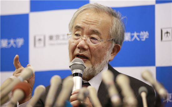[아시아경제 이지은 기자]2016 노벨 생리의학상 수상자인 오스미 요시노리 도쿄공업대 교수가 3일 도쿄공업대에서 열린 기자회견에서 수상소감을 밝히고 있다. 그는 세포에서 제대로 작동하지 않는 단백질이 이상을 일으키기 전에 완전히 제거하는 오토파지(자식작용) 현상을 밝혀낸 공로로 노벨상을 받았다.