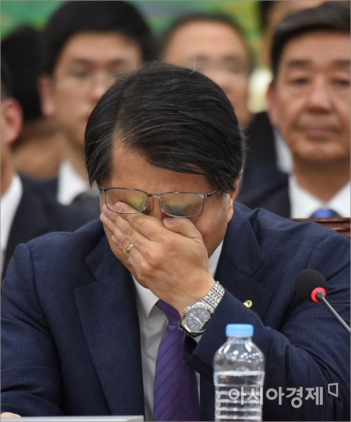 [아시아경제 윤동주 기자] 진웅섭 금감원장이 13일 국회에서 열린 정무위원회의 금융감독원 등에 대한 종합국정감사에서 피곤한듯 한 제스처를 취하고 있다.