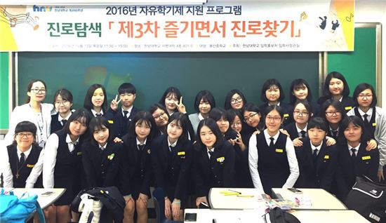 [아시아경제(대전) 정일웅 기자] 한남대는 최근 대전봉산중학교 학생 30명을 초청해 ‘제3차 즐기면서 진로 찾기’ 자유학기제 프로그램을 진행했다고 16일 밝혔다. 프로그램은 참여 학생들이 소그룹을 지어 자신의 적성에 맞는 직업을 탐색하는 ‘직업 카드놀이’와 의류학과를 학과 체험하는 시간 등으로 진행됐다. 봉산중 학생들이 프로그램 참여를 마치고 기념사진을 찍고 있다. 한남대 제공