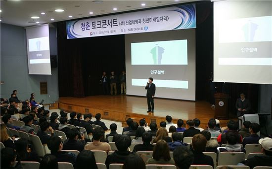 [아시아경제(대전) 정일웅 기자] 국민의당 안철수 전 공동대표가 1일 대전 유성구 소재 한밭대에서 ‘4차 산업혁명과 청년미래일자리’라는 주제로 청춘 토크콘서트를 진행했다. 안 전 공동대표가 토크콘서트 참석자들과 대화를 이어가고 있다. 한밭대 제공