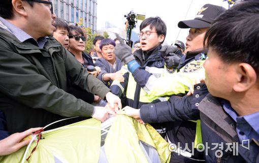 [아시아경제 문호남 인턴기자] '우리 모두가 블랙리스트 예술가다' 예술행동위원회 회원들이 4일 서울 종로구 광화문 광장에서 박근혜 대통령 퇴진 촉구 시국선언.