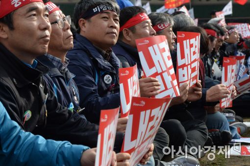 [아시아경제 문호남 인턴기자] 12일 서울 중구 서울광장에서 열린 '전태일열사 정신계승 2016 전국노동자대회'에서 참석자들이 대통령 퇴진을 촉구하는 문구가 적힌 피켓을 들고 구호를 외치고 있다.