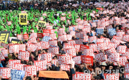 [아시아경제 문호남 인턴기자] 12일 서울 중구 서울광장에서 열린 '전태일열사 정신계승 2016 전국노동자대회'에서 참석자들이 대통령 퇴진을 촉구하는 문구가 적힌 피켓을 들고 구호를 외치고 있다.