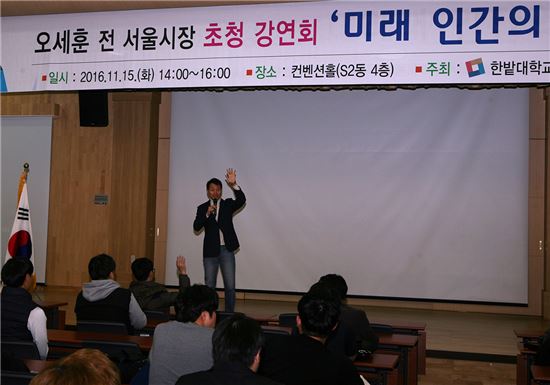 [아시아경제(대전) 정일웅 기자] 한밭대는 15일 오세훈 전 서울시장을 초청해 ‘미래 인간의 조건’이라는 주제로 강연회를 열었다고 밝혔다. 오 전 서울시장이 강단에서 한밭대 재학생들을 대상으로 강연을 이어가고 있다. 한밭대 제공