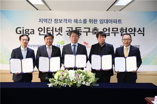 [아시아경제 이민찬 기자] 한국토지주택공사(LH)는 24일 서울 논현동 LH 서울지역본부에서 한국정보화진흥원, SK브로드밴드, KT, CJ헬로비전과 함께 '기가인터넷 공동구축 업무협약'을 체결했다고 밝혔다.