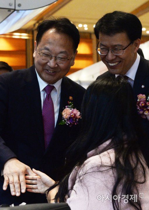 [아시아경제 문호남 인턴기자] 유일호 경제부총리 겸 기획재정부 장관(왼쪽)과 박용호 청년위원회 청년위원장이 28일 서울 삼성동 코엑스에서 기획재정부 주최로 열린 '2016 공공기관 채용정보 박람회'에서 구직자와 인사를 나누고 있다. 이번 박람회는 채용설명회관, 직업기초능력검사관 및 모의면접관 등 부스를 통해 2017년도 공공기관의 채용 정보를 제공하며 오는 29일까지 운영된다.