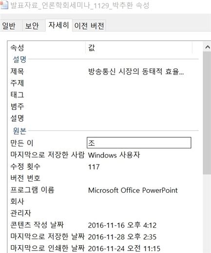 A교수가 이날 발표하는 발표문 파일은 A교수가 아닌 '조OO'가 작성한 것으로 문서정보에서 확인됐다. 조모씨는 LG유플러스 직원으로 알려졌다.