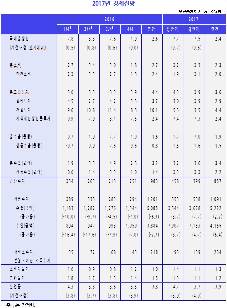 KDI는 7일 발간한 'KDI 경제전망(2016년 하반기)' 책자에서 "우리 경제는 수출부진이 지속되는 가운데, 내수도 점차 둔화되면서 내년에 2.4%의 성장률을 기록할 전망"이라고 밝혔다. KDI는 지난 6월 내년 성장률을 2.7%로 예상했었다.