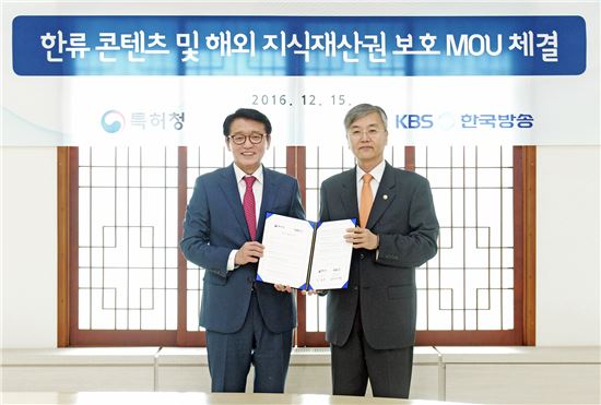 [아시아경제(대전) 정일웅 기자] 특허청은 15일 여의도 KBS본관에서 KBS와 ‘한류 콘텐츠 및 해외 지재권 보호’에 관한 업무협약을 체결했다. 최동규 특허청장(오른쪽)과 고대영 KBS사장이 협약 체결 후 기념사진을 찍고 있다. 특허청 제공