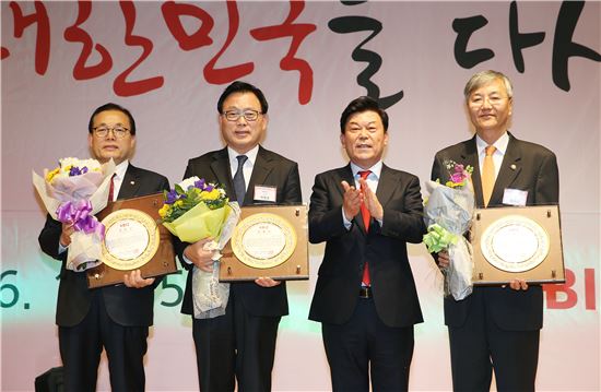 [아시아경제(대전) 정일웅 기자] 특허청은 15일 서울 여의도 소재 중소기업중앙회 그랜드홀에서 열린 ‘2016년 중소기업 송년연찬회’에 최동규 특허청장이 참석해 우수 지원기관 감사패를 수상했다고 밝혔다. 중소기업중앙회는 중소기업의 지식재산 경영 지원을 위해 노력한 공로로 최 청장에게 감사패를 수여했다. 최 청장(왼쪽 네 번째)과 이채익 국회의원(왼쪽 첫 번째), 박광온 국회의원(왼쪽 두 번째), 박성택 중소기업중앙회장(왼쪽 세 번째) 등이 시상식 후 기념사진을 찍고 있다. 특허청 제공