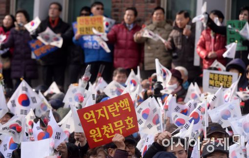 [아시아경제 문호남 인턴기자] 박근혜를 사랑하는 모임(박사모) 등 보수단체 회원들이 17일 서울 종로구 안국역 인근에서 박근혜 대통령 탄핵 반대 집회를 열고 .