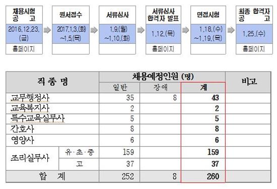 시교육청은 23일 본청 홈페이지를 통해 ‘2017년 교육공무직원 공개경쟁채용시험 공고’를 발표했다. 공고된 채용인원은 올 상반기에 진행된 교육공무직원 규모(136명)보다 1.9배가량 많다.