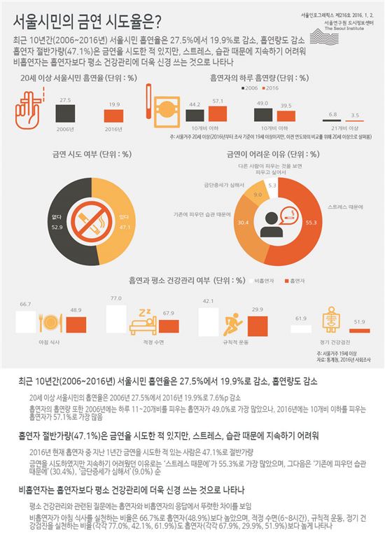2일 서울연구원에 발표한 서울인포그래픽스 제216호 '서울 시민의 금연 시도율은?'을 보면 흡연자 절반가량(47.1%)은 금연을 시도한 적이 있지만 스트레스, 습관 때문에 지속하기 어려운 것으로 나타났다.
