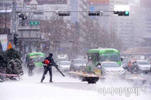 [아시아경제 문호남 수습기자] 서울 아침 최저기온이 영하 11도로 가장 강력한 추위를 보인 13일 서울 중구 서울광장에서 환경미화원들이 눈을 치우고 있다. 기상청은 서울 낮 기온이 영하 1도에 머무는 등 종일 영하권 추위가 이어질 것으로 전망했다.