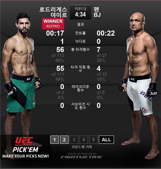 이후 2라운드 시작과 함께 터져 나온 로드리게스의 강력한 앞차기에 펜은 결국 쓰러졌고 로드리게스의 무자비한 파운딩 앞에서 BJ 펜은 더 이상 저항하지 못한 채 경기를 끝마쳤다.