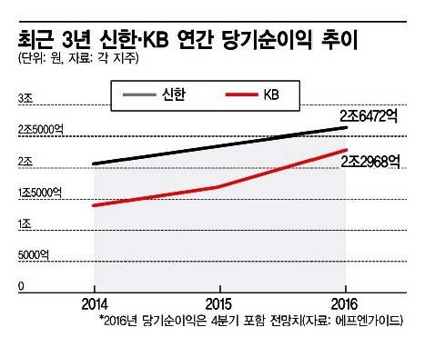 신한지주는 독보적인 리스크 관리 역량을 무기로 지난해까지 9년 연속 '당기순이익 1위' 수성이 유력하다. KB지주는 2014년 경영진 내분 사태로 실적이 주춤했으나 윤종규 회장 취임 이후 조직을 안정적으로 재정비, 올해 목표로 '1위 탈환'을 천명했다. 금융 업계에 판도 재편이 일어날 지 관심이 모아진다.