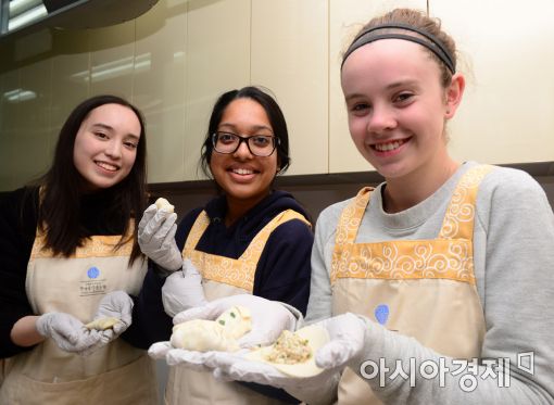 [아시아경제 문호남 수습기자] 외국인들이 17일 서울 용산구 숙명여자대학교 내 한국음식연구원에서 열린 설맞이 음식문화 체험 행사에서 직접 만든 만두와 함께 .