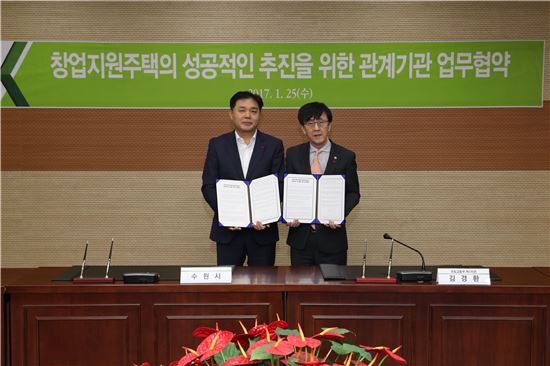 25일 국토교통부는 서울 한강홍수통제소에서 수원과 용인, 부산, 대구, 광주, 창원시와 창업지원주택 사업을 위한 업무협약(MOU)을 맺었다. 앞서 국토부는 지난해 7~9월간 지자체로부터 사업후보지를 제안받아 입지여건 등을 심사했으며 최적 후보지 6곳을 선정해 이번에 MOU를 맺었다.