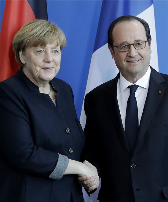 [아시아경제 조목인 기자]27일(현지시간) 베를린에서 만난 앙겔라 메르켈 독일 총리와 프랑수아 올랑드 프랑스 대통령이 기자회견을 하기 전 악수하며 웃고 있다.