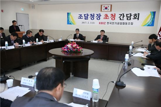 [아시아경제(대전) 정일웅 기자] 정양호 조달청장은 1일 경기도 성남시 소재 한국전기공업협동조합을 방문해 조합에 가입된 중소기업 대표들과 간담회를 진행했다. 간담회는 경영현장에서 느끼는 기업대표의 애로사항을 청취, 공공시장 참여 확대 방안을 논의하기 위해 마련됐다. 정 청장(정면 왼쪽 두 번째)이 간담회를 주재하며 기업대표들의 의견을 청취하고 있다. 조달청 제공
