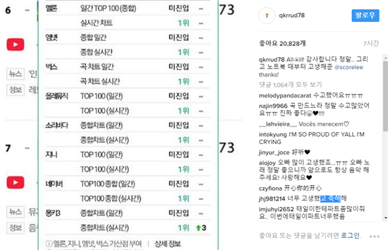 박경은 6일 자신의 인스타그램에 "All-kill! 감사합니다 정말.. 그리고 노트북 때부터 고생해준 @screlee thanks!"라는 글과 함께 한 장의 사진을 올렸다.