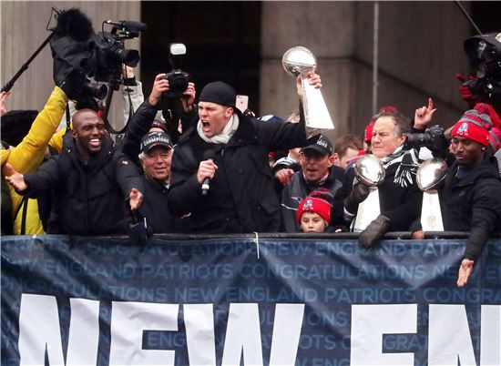 [아시아경제 이혜영 기자] 51회 미국프로풋볼(NFL) 챔피언 결정전 슈퍼볼에서 역대 5번째 우승을 차지한 뉴잉글랜드 패트리어츠 선수들이 7일(현지시간) 매사추세츠주 보스톤 시내에서 축하 퍼레이드를 하고 있다. MVP로 선정된 쿼터백 톰 브래디가 우승 트로피를 들어올리며 팬들의 환호에 답하고 있다.
