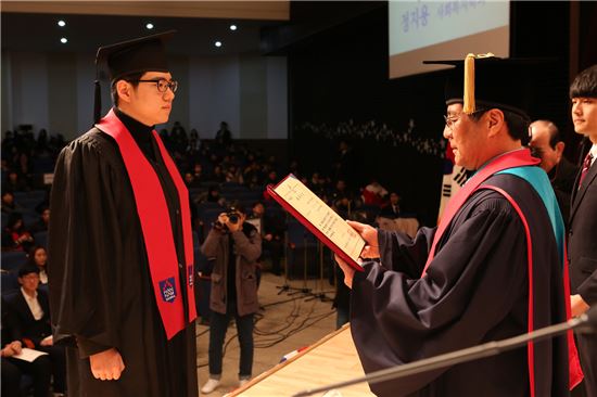 [아시아경제(대전) 정일웅 기자] 한남대는 10일 교내 성지관에서 ‘제55회 2016학년도 전기 학위수여식’을 개최했다. 이날 대학은 박사 51명, 석사 313명, 학사 2676명, 공개과정 52명 등 3092명의 졸업생을 배출했다. 이덕훈 총장(오른쪽)이 졸업생에게 상장과 학위증서를 수여하고 있다. 한남대 제공