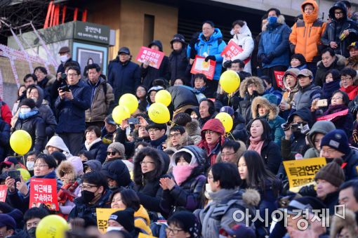 [아시아경제 문호남 수습기자] 헌법재판소의 신속한 탄핵 결정과 특검 수사 연장을 촉구하는 15차 촛불집회가 열리는 11일 시민들이 서울 세종문화회관 앞에서 이.