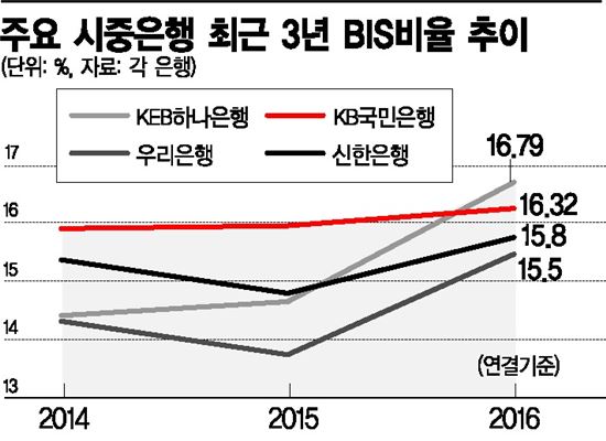 은행권은 2019년부터 바젤Ⅲ 도입으로 강화된 규제를 적용받게 된다. 금융 당국은 이에 맞춰 BIS비율을 14% 이상 유지하도록 권고하고 있다. 지난해 4분기 기준 국내 주요 은행 BIS비율은 신한은행 15.8%, KB국민은행 16.32%, KEB하나은행 16.79%, 우리은행 15.5% 등이다. 향후 자본적정성 관리가 강화될수록 BIS비율의 미세한 움직임에도 은행권이 민감하게 반응할 수밖에 없는 상황이다.
