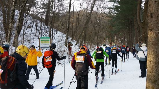 [아시아경제(대전) 정일웅 기자] 산림청은 18일 강원도 횡성 청태산자연휴양림에서 ‘제13회 산림청장배 전국산악스키대회’를 개최한다. 대회는 남녀 장년부·청년부·주니어부 6개 부문으로 나뉘어 진행된다. 참가는 산악스키를 즐기는 사람이면 누구나 할 수 있다. 이 대회는 산악레포츠 분야 활성화를 목적으로 지난 2002년부터 열렸다. 기타 자세한 내용은 대한산악스키협회(http://kafsma.or.kr) 공지사항을 통해 확인할 수 있다. 지난해 대회 참가자들이 열을 맞춰 이동하고 있다. 산림청 제공