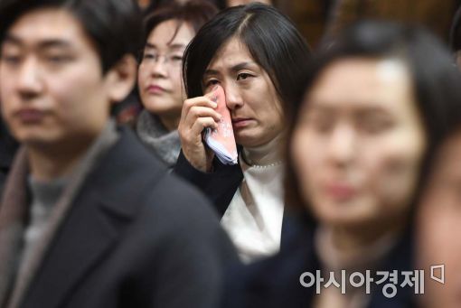 [아시아경제 백소아 기자] 21일 서울 서대문구 이화여자대학교에서 열린 2017년 이화여자대학교 학생군사교육단(ROTC) 제1기 입단식에서 한 어머니가 딸의 훈련 영상을 보다가 눈물을 닦고 있다.