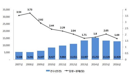 $pos="C";$title="2007년~2016년 수입건수 및 수입화물처리 시간 현황 그래프. 관세청 제공";$txt="2007년~2016년 수입건수 및 수입화물처리 시간 현황 그래프. 관세청 제공";$size="550,312,0";$no="2017022409314151669_2.jpg";@include $libDir . "/image_check.php";?>[아시아경제(대전) 정일웅 기자] 지난해 공항·항만 내 수입화물 처리시간이 전년대비 18% 단축됐다. 이는 최근 10년 사이에 최단 시간으로 기록된다.