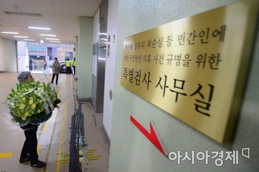 [아시아경제 백소아 기자] 박근혜 정부의 최순실 등 민간인에 의한 국정농단 의혹 사건 규명을 위한 특검 수사종료일인 28일 서울 강남구 특검사무실에 꽃다발이 배달되고 있다. 꽃다발에는 '고맙고 감사합니다. 특검팀 힘내십시요'라고 적혀있다.