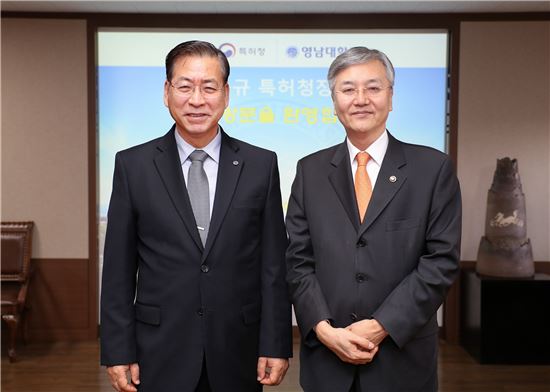 [아시아경제(대전) 정일웅 기자] 최동규 특허청장은 2일 경북 경산 소재 지식재산교육 선도대학인 영남대를 방문, 현장 관계자들과 대학가의 지식재산 교육 확산 방안을 논의했다. 최 청장(왼쪽 두 번째)과 영남대 서길수 총장(왼쪽 첫 번째)이 기념촬영을 하고 있다. 특허청 제공